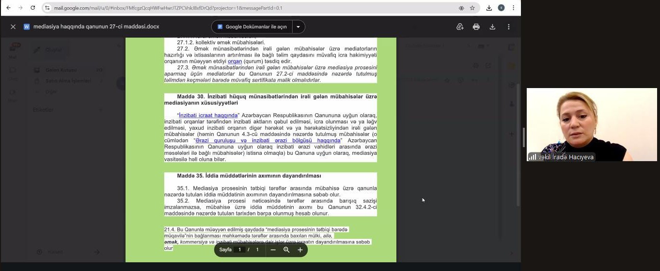 Oktyabrın 11-də Vəkillər Kollegiyası Tədris Mərkəzinin təşkilatçılığı ilə "İş yerində diskriminasiya və fərdi əmək mübahisələrinin həlli" mövzusunda distant formada təlim keçirilib.
