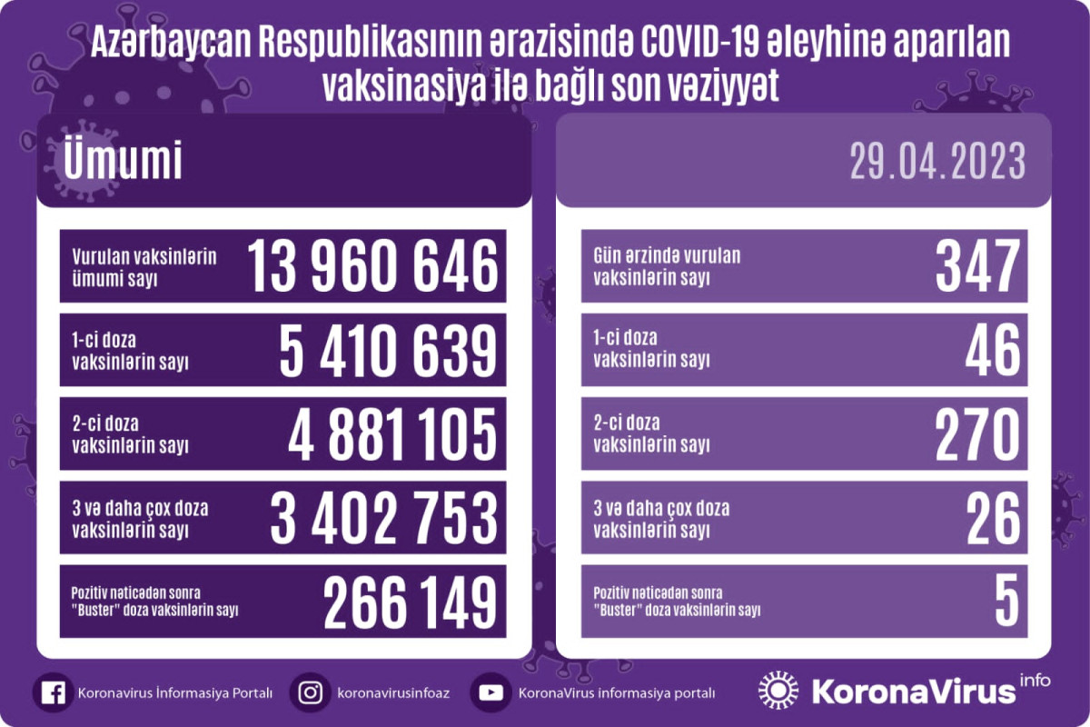 Как сообщили e-huquq.az в оперативном штабе при Кабинете министров, за день число получивших первую дозу вакцины составило 46, вторую дозу получили 270, бустерную дозу – 26 человек. Число вакцинированных бустерной дозой после сдачи позитивного теста на коронавирус составило 5.
