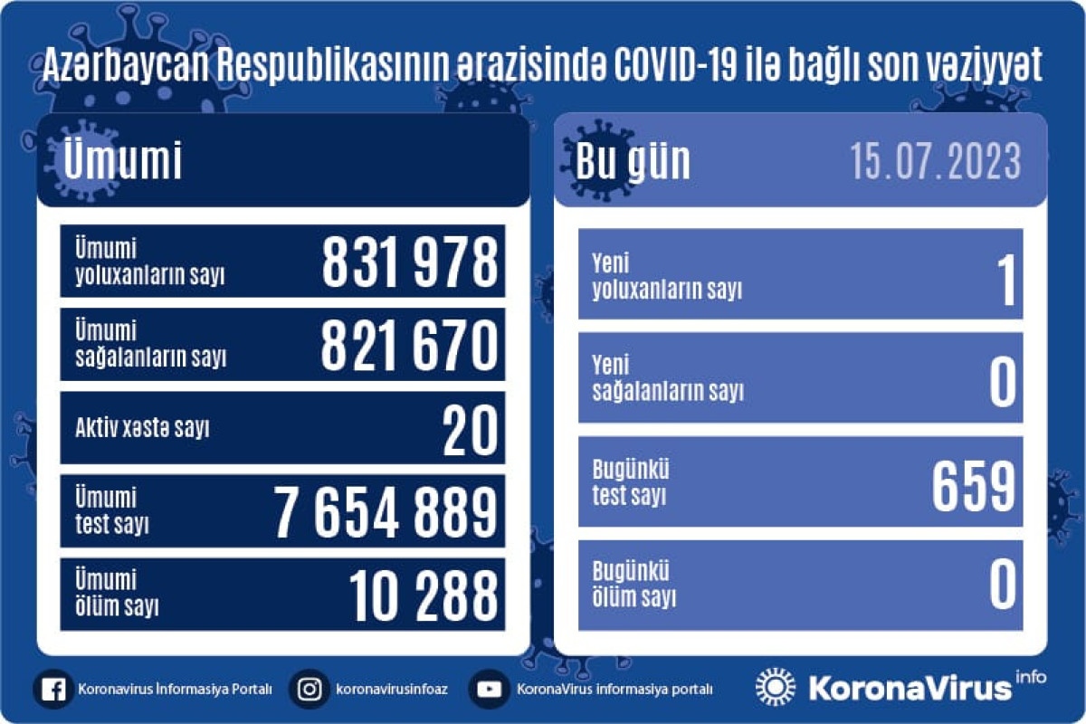 До сегодняшнего дня в Азербайджане выявлено 831 978 случаев заражения коронавирусной инфекцией, 821 670 человек вылечились, 10 288 скончались, число активных больных – 20.